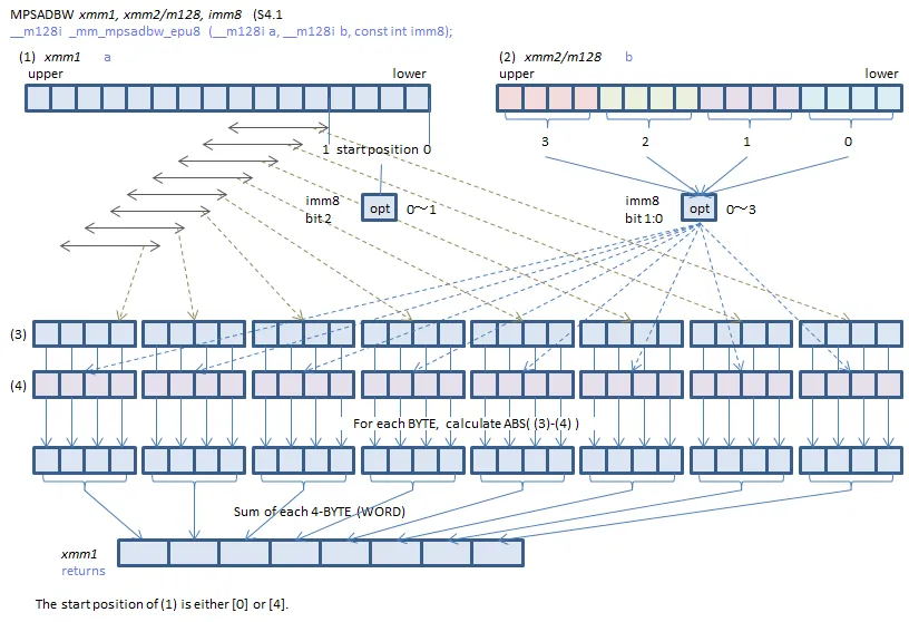 (V)MPSADBW calculates packed word results of sum-absolute-difference (SAD) of unsigned bytes from two blocks of 32-bit dword elements, using two select fields in the immediate byte to select the offsets of the two blocks within the first source operand and the second operand. Packed SAD word results are calculated within each 128-bit lane. Each SAD word result is calculated between a stationary block_2 (whose offset within the second source operand is selected by a two bit select control, multiplied by 32 bits) and a sliding block_1 at consecutive byte-granular position within the first source operand. The offset of the first 32-bit block of block_1 is selectable using a one bit select control, multiplied by 32 bits.